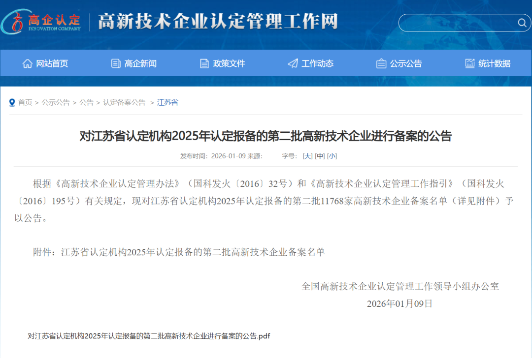 近日,根据《高新技术企业认定管理办法》及相关规定,全国高新技术企业认定管理工作领导小组办公室对江苏省认定机构2025年认定报备的第二批企业进行备案公示。公海jcjc5500凭借其扎实的科技创新实力与完善的研发管理体系,成功荣列在本次备案中。