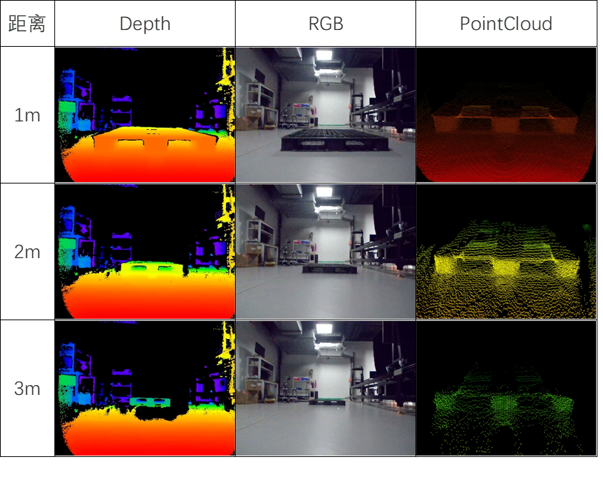 黑色托盘的tof相机检测结果如下图所示,depth为深度图,RGB为彩色图,PointCloud为点云数据,将原始点云通过感知算法处理,最终输出托盘相对于车体中心的二维位姿。